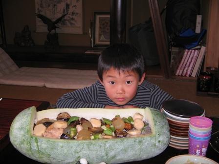 イベント3。農園の方が用意してくださったお昼ごはん。大きな冬瓜をくりぬいてそのまま器になっています。